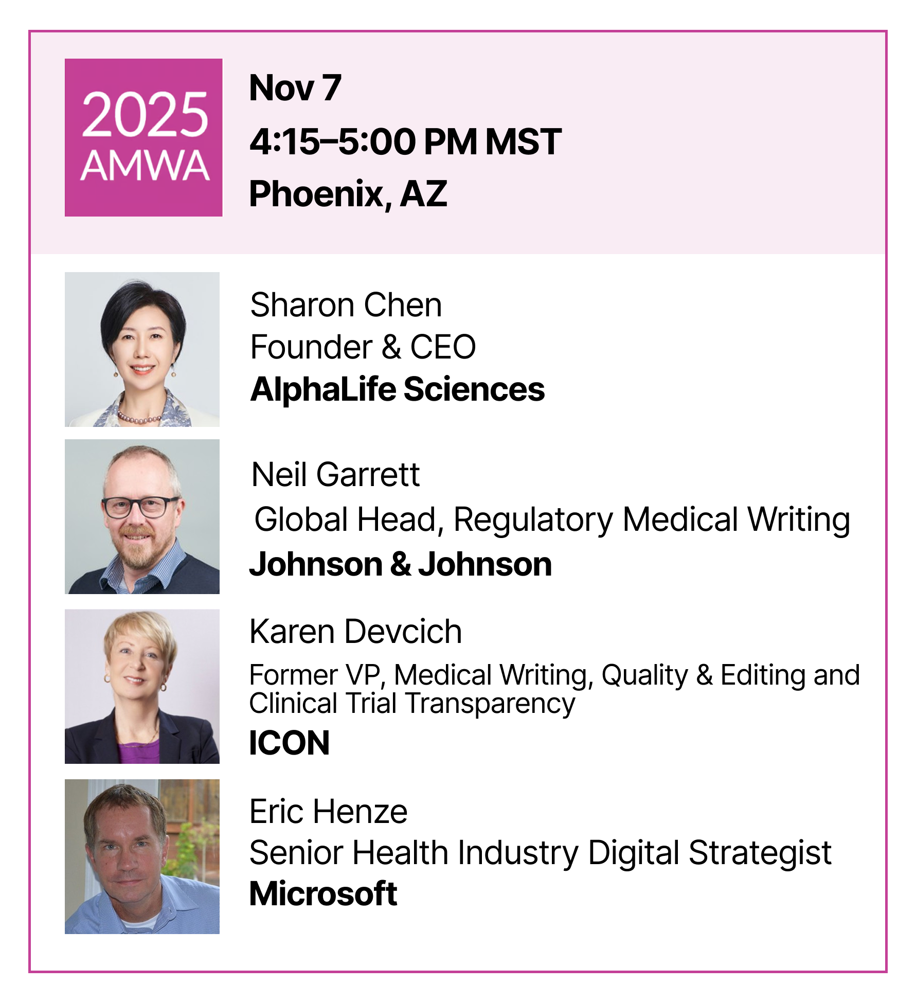 This session offers a rare, high-value opportunity for audiences to hear directly from top-10 global pharma, AlphaLife Sciences as the solution enabler, and Microsoft on the future of AI in regulatory and medical authoring. Attendees will experience enterprise-grade, agentic AI solutions, including auto-templating and scalable workflows that cover the full spectrum of document types such as Protocol, SAP, CSR, DSUR/PBRER, and CTD Module 2.7.x. A demo will showcase end-to-end document automation with built-in QC in Microsoft Word and Veeva RIM, complemented by agent-based platforms for enterprise customization. The panel discussion brings together pharma experts to share practical insights on business value, adoption challenges, solution requirements, and change-management practices for AI at scale, —giving you direct insight into what’s working and how to accelerate your own roadmap confidently